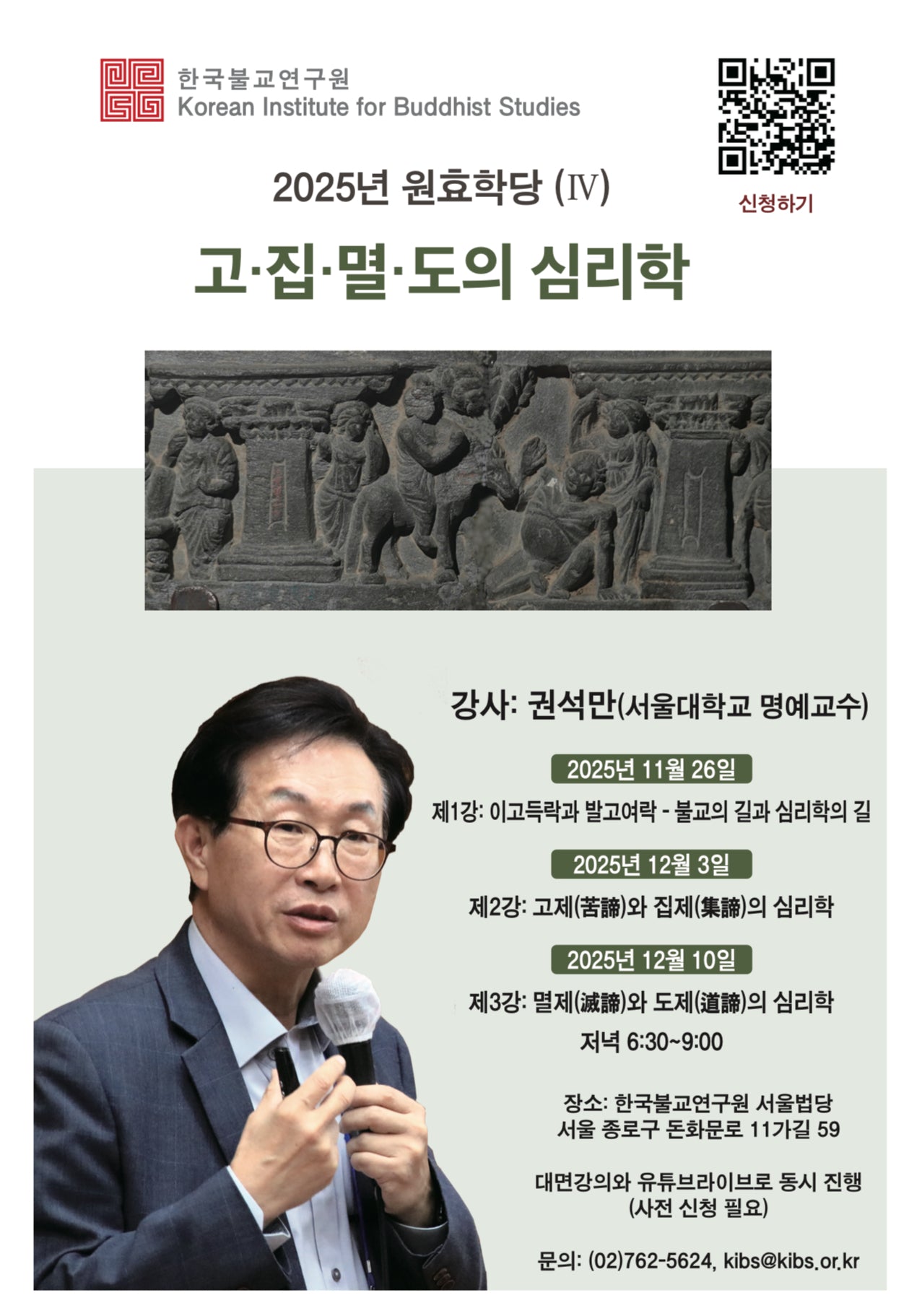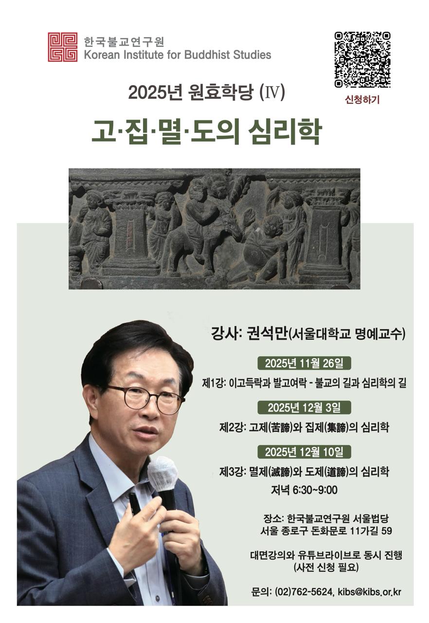 (사)한국불교연구원에서는 오는 11월 26일(수) 6시 30분부터 3주간 ⟪고・집・멸・도의 심리학⟫이라는 주제로 2025년 원효학당 네 번째 강좌를 개최합니다.
